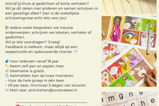Elke week hebben we schrijversgroep in 'De Magneet' Hoogeveen. We zitten samen te schrijven. De ene keer zijn het gedichten, de andere keer korte verhalen. We hebben telkens andere thema's.